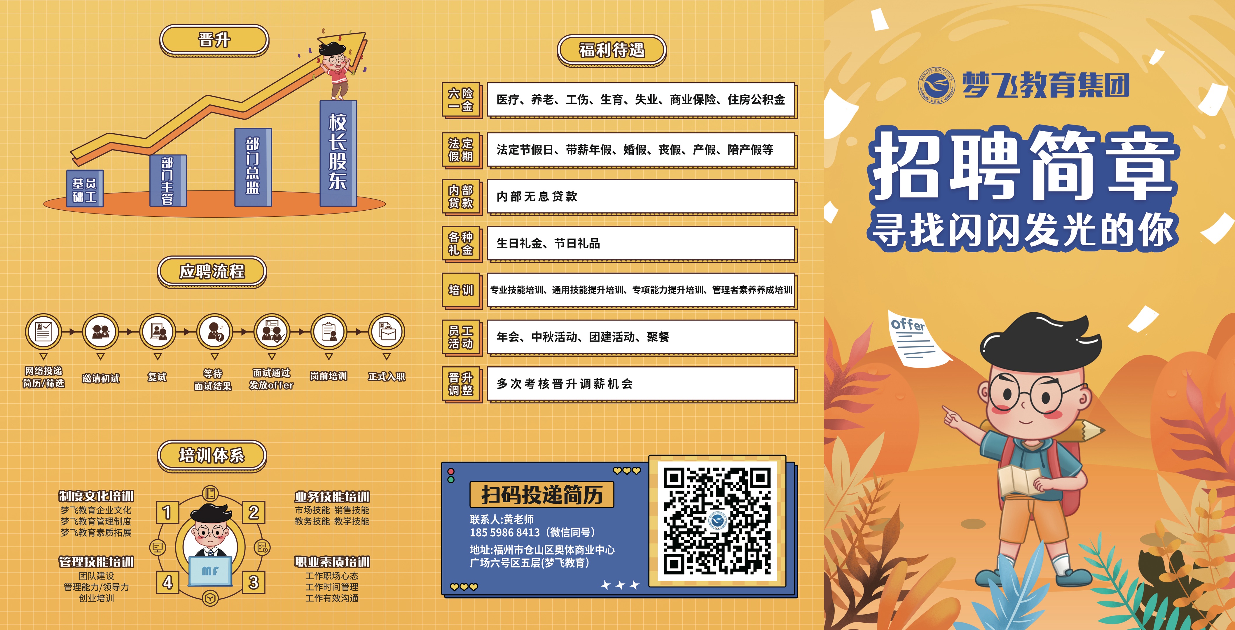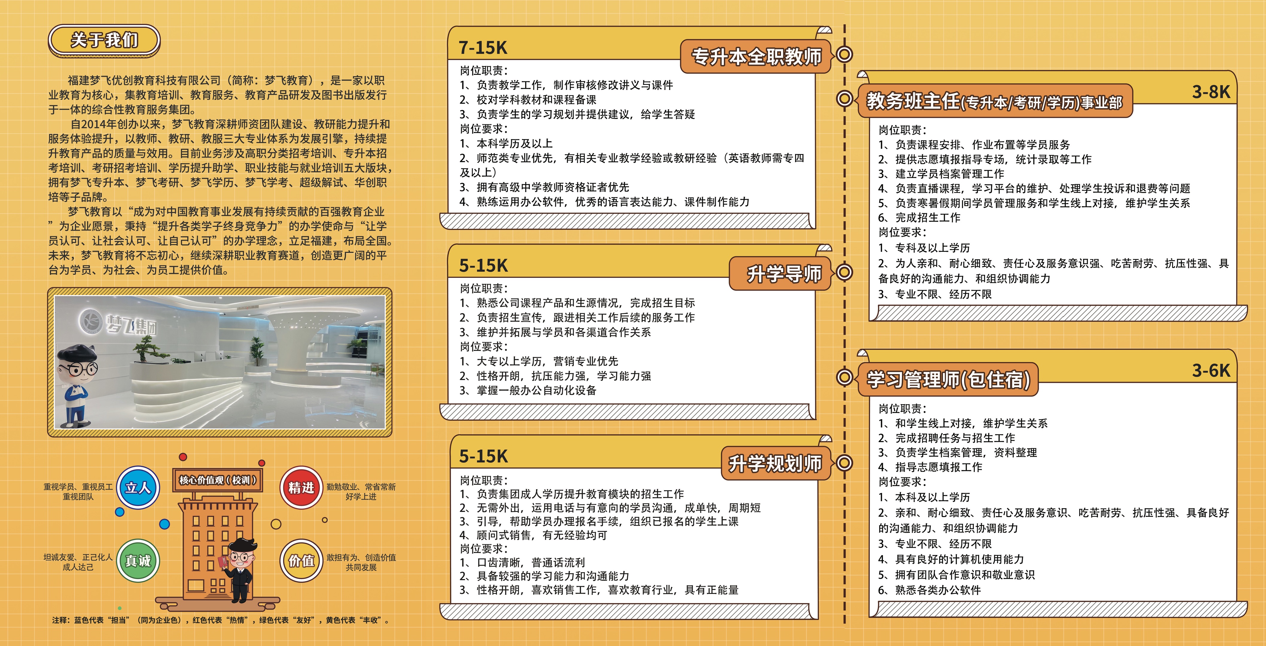 福建梦飞优创教育科技有限公司(简称:梦飞教育),是一家以职业教育为核心,集教育培训、教育服务、教育产品研发及图书出版发行于一体的综合性教育服务集团。自2014年创办以来,梦飞教育深耕师资团队建设、教研能力提升和服务体验提升,以教师、教研、教服三大专业体系为发展引警,持续提升教育产品的质量与效用。目前业务涉及高职分类招考培训、专升本招考培训、考研招考培训、学历提升助学、职业技能与就业培训五大版块拥有梦飞专升本、梦飞考研、梦飞学历、梦飞学考、超级解试、华创职培等子品牌。梦飞教育以“成为对中国教育事业发展有持续贡献的百强教育企业为企业愿景,秉持“提升各类学子终身竞争力”的办学使命与“让学员认可、让社会认可、让自己认可”的办学理念,立足福建,布局全国未来,梦飞教育将不忘初心,继续深耕职业教育赛道,创造更广阔的平台为学员、为社会、为员工提供价值。