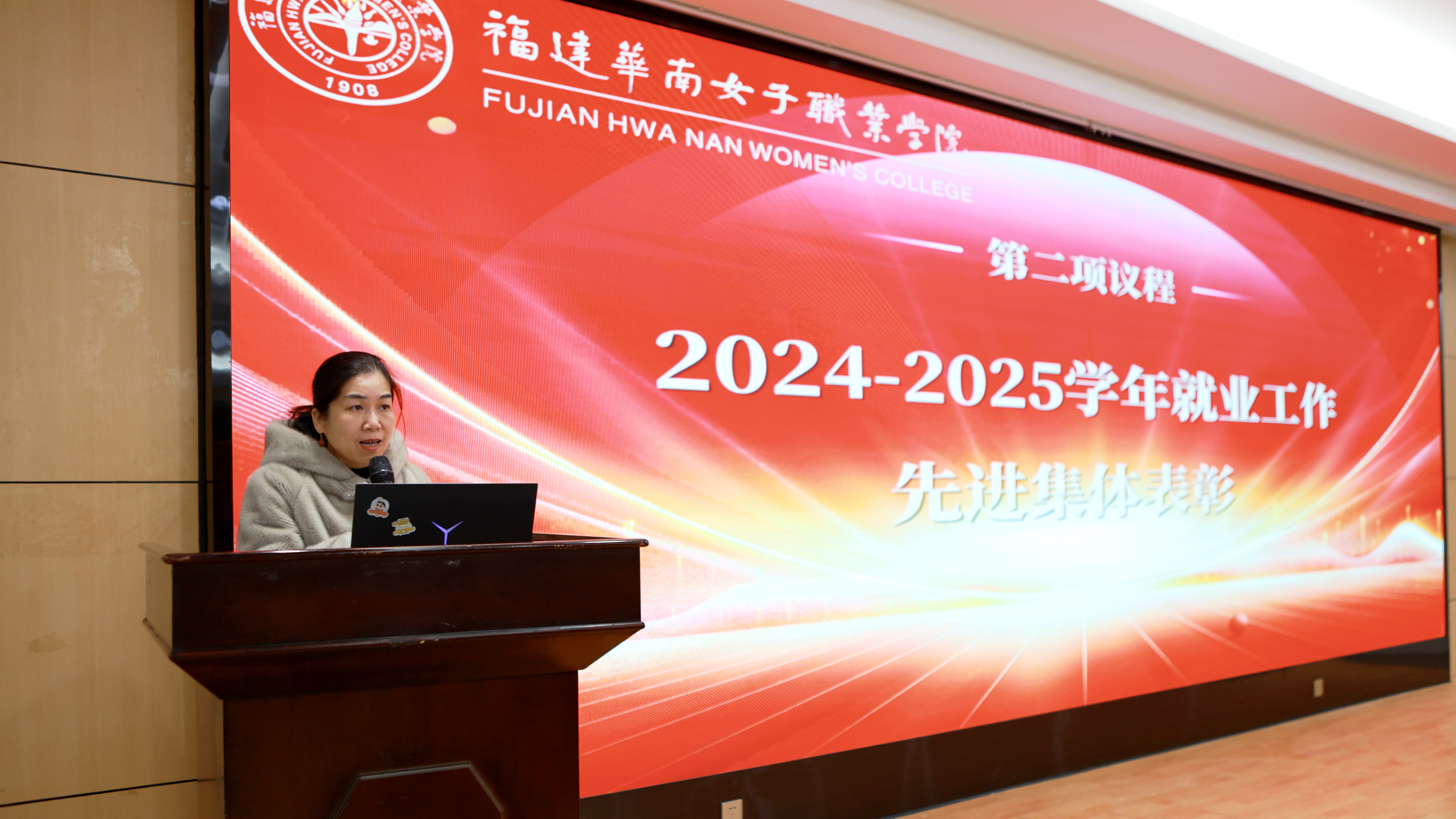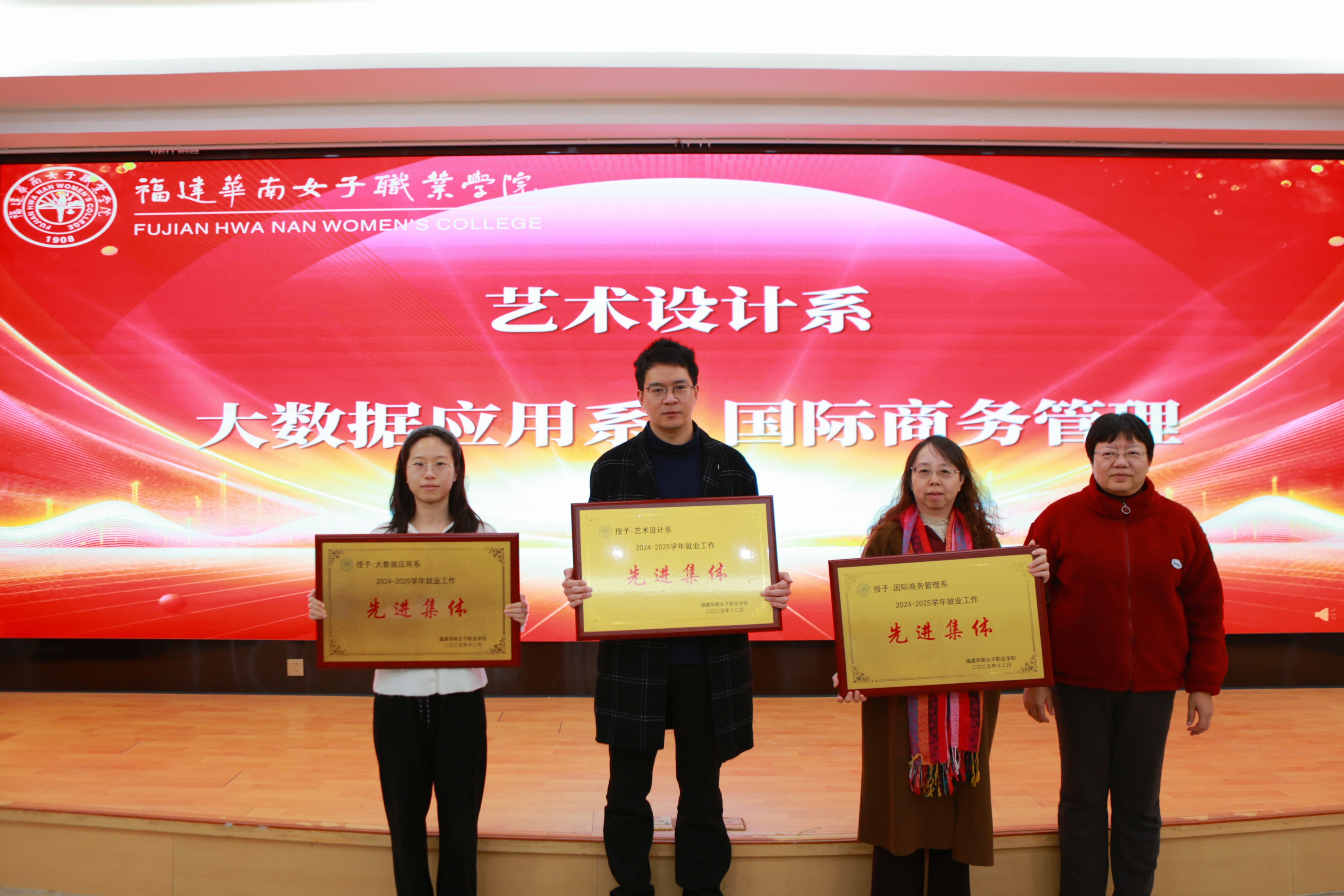 副校长吴岚葭宣读了《福建华南女子职业学院关于表彰2024-2025学年就业工作先进集体的决定》。随后,校长任建红为获奖的先进集体颁发荣誉牌匾,肯定了他们在推动学生就业工作中发挥的榜样引领作用。